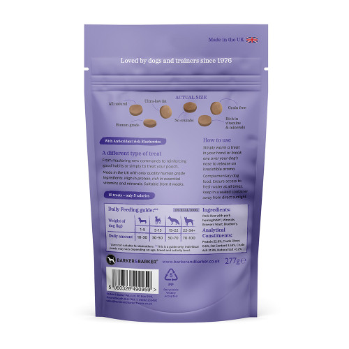 As you would expect of all Barker & Barker products, we use only the best 'human grade' ingredients in the Blueberry & Liver Treats. There are no artificial additives at all, everything is 100% natural, healthy & above all - tasty.