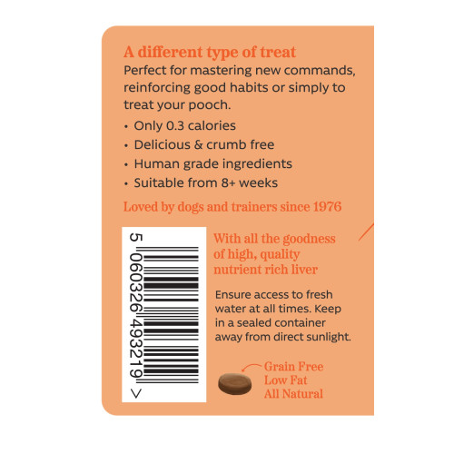 Our Little Liver Treats©, the smallest of our treats, have been sized especially for repeat reward training where you will typically reward a high number of times in one session, whether in an organised class, out and about or at home. Being small and low fat/ low calorie you won't have to worry about adjusting your dogs food intake, which is something you have to consider with all other less healthy treats on the market today - this has helped make them a vets favourite all over the UK.